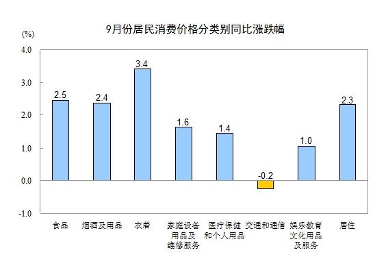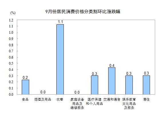 9月份,非食品價格環(huán)比上漲0.4%。其中,衣著、交通和通信、居住、醫(yī)療保健和個人用品、娛樂教育文化用品及服務(wù)價格分別上漲1.1%、0.4%、0.3%、0.3%和0.3%;煙酒及用品、家庭設(shè)備用品及維修服務(wù)價格持平(漲跌幅度為0)。居住中,水、電、燃料價格上漲0.3%。