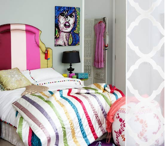 仿佛是打開的薰衣草一般的夢幻淡紫撲面而來,那樣清淺的顏色糅合了紫色的沉郁和白色的 純粹,再搭配精致的粉色,更添一種浪漫風(fēng)情,斑斕的碎花床罩,突出的是一種自然詩意朦朧,明快的藤黃更是帶來了一種春一般的溫暖感覺。