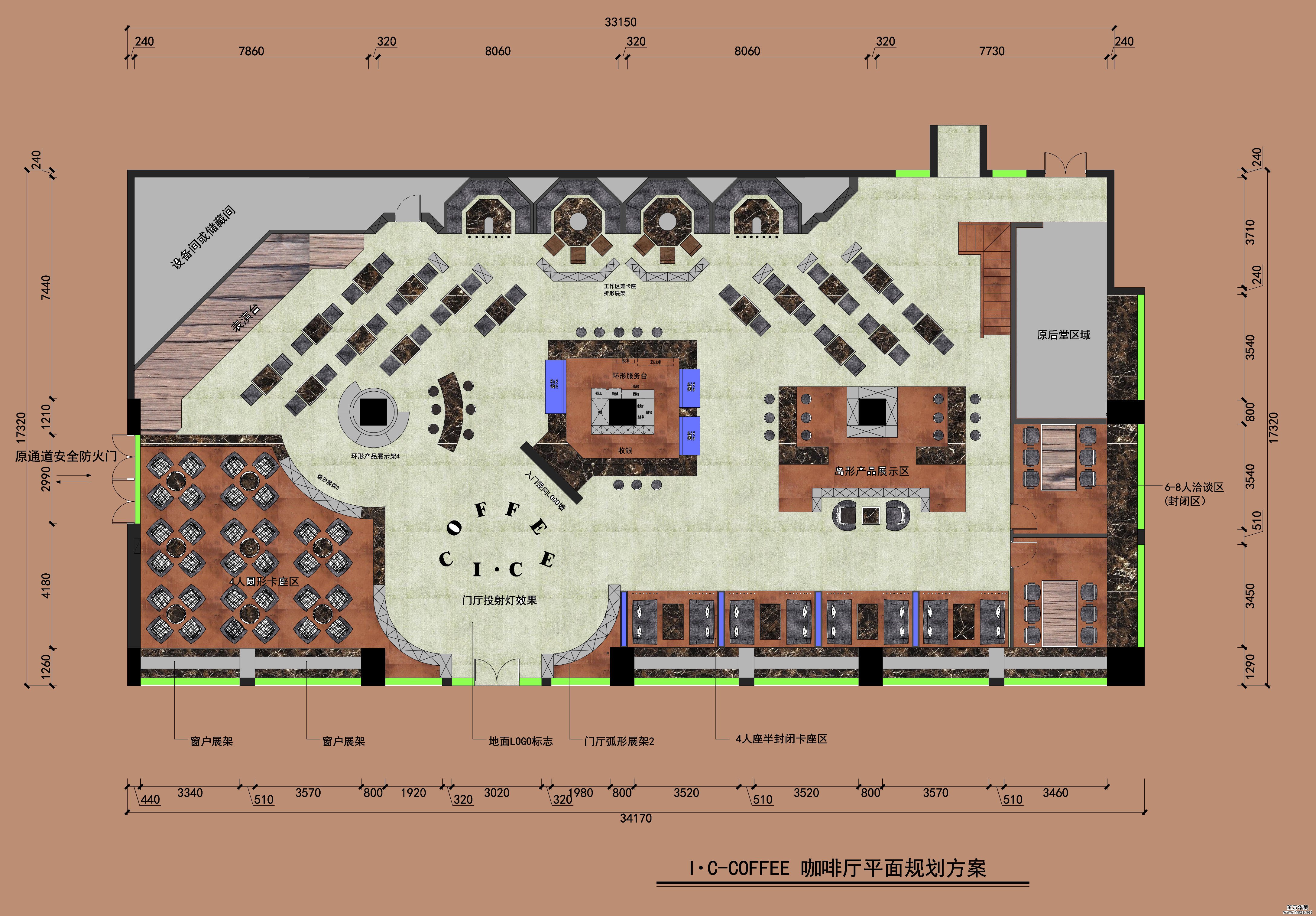 ▄設(shè)計風(fēng)格定位: 針對當(dāng)下咖啡廳特色、特點、結(jié)合IC咖啡的品牌、形象、服務(wù)、理念,由此裝飾設(shè)計的訴求點在未來5-15年的經(jīng)營過程中完勝于周圍已存在的類似性經(jīng)營場所。因項目處于建筑物一層,市政綠化帶以內(nèi)無視線阻擋,視線開闊,門頭設(shè)計可反向于原建筑幕墻體增加咖啡廳的特點,又不失檔次,夜幕下利用櫥窗展示體現(xiàn)出亮化效果。 此案例的主要風(fēng)格是復(fù)古工業(yè)風(fēng),空間布局上以環(huán)形動線為主,分為入場主動線、入各功能區(qū)輔助線、展示區(qū)觀賞停頓動線,環(huán)型服務(wù)臺可服務(wù)四周。以經(jīng)營者的思路易進不易出的動線設(shè)計,橫向流動,豎向45度向內(nèi)引導(dǎo)“八”字形設(shè)計,聚焦于前位島式展臺、中位環(huán)形服務(wù)臺、內(nèi)位表演區(qū)及藝術(shù)長廊式展架,第一個點都留有讓消費者駐足的理由。 在空間構(gòu)成上,呈現(xiàn)出最佳設(shè)計效果,材料的合理運用體現(xiàn)了裝飾的最佳立體質(zhì)感,局部采用金屬色、銹紅色以及深色,為了更好的體現(xiàn)整個咖啡廳的氛圍,立面材料運用多元而不繁雜,燈光和家具的選用也是重中之重。